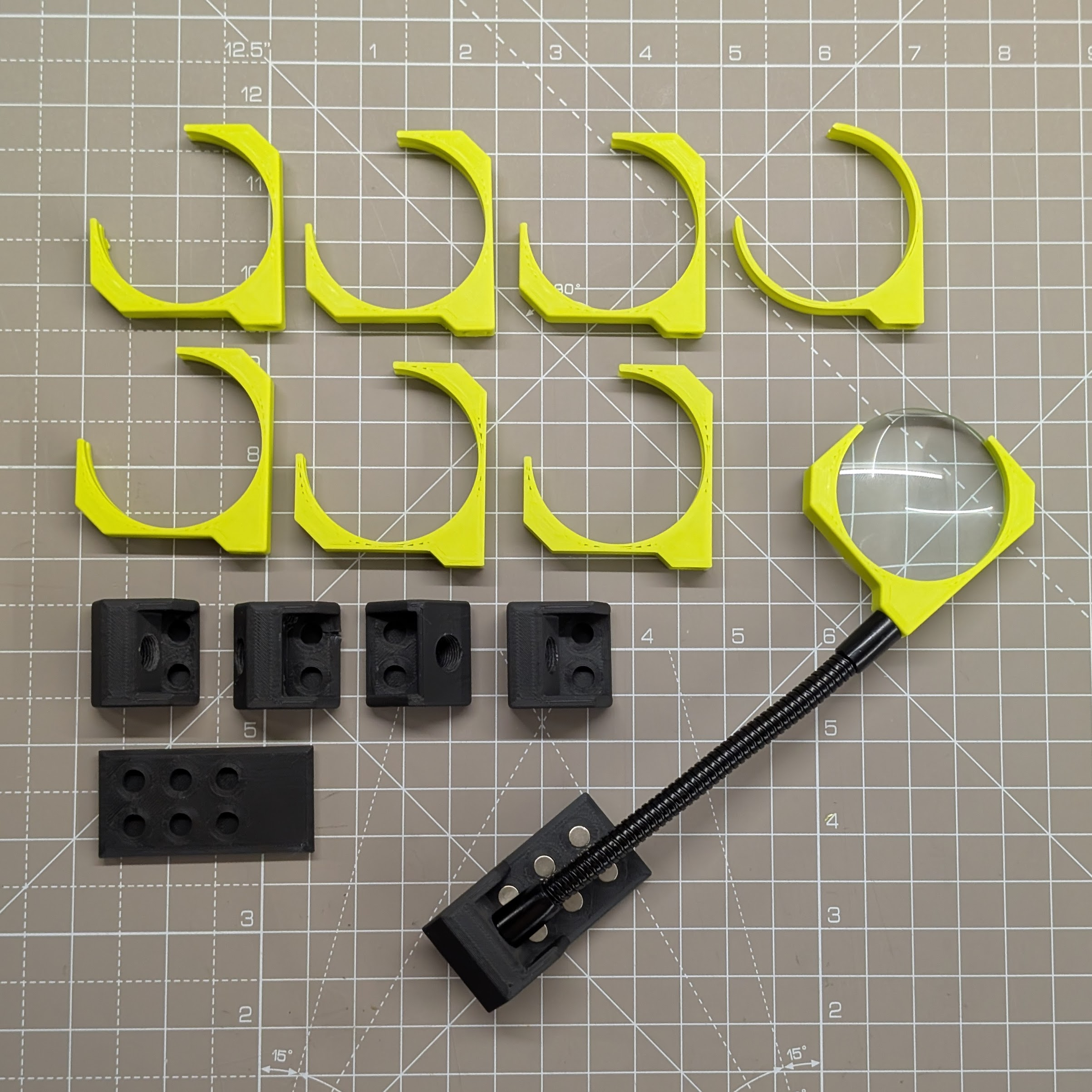 A base da lupa ocupa dois slots na grade; foi o necessário para garantir uma boa estabilidade para o módulo. Isso também permitiu adicionar mais ímãs para que a adesão na grade (e na mesa, durante o uso) fosse melhor. O gooseneck se conecta na base e no encaixe da lupa diretamente pelas roscas M10 (na base) e M8 (no adaptador). Usei filamento preto e um "amarelo fluorescente" da SUNLU para seguir a paleta de cores original do kit.